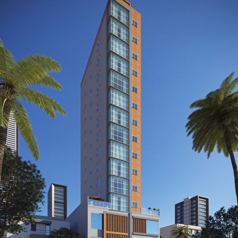 Edifício localizado na região Central de Balneário Camboriú com 2 suítes, lavabo, sala de estar e cozinha integrada, área de serviço, ponto para churrasqueira e 2 vagas de garagem.