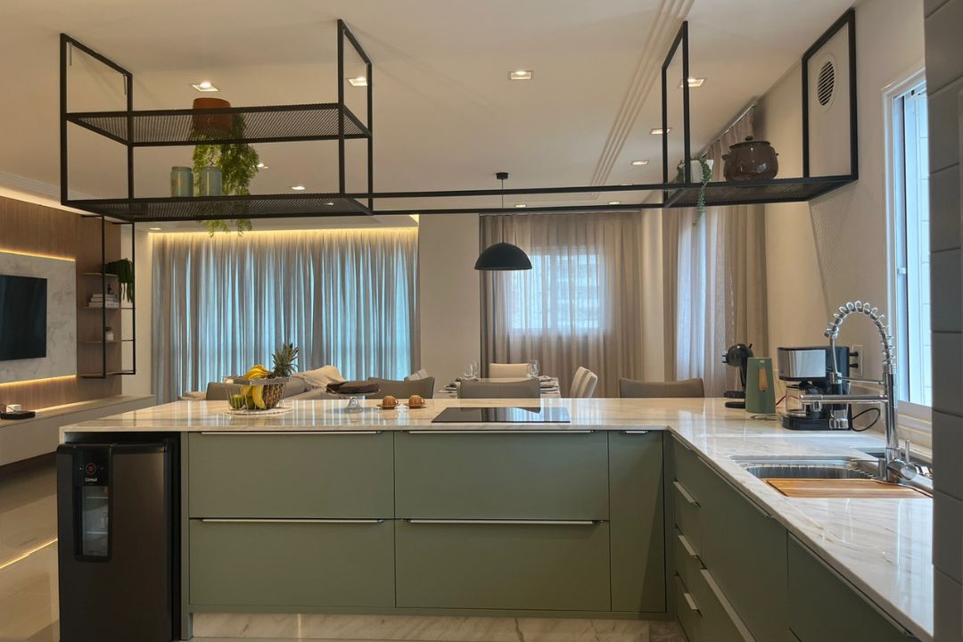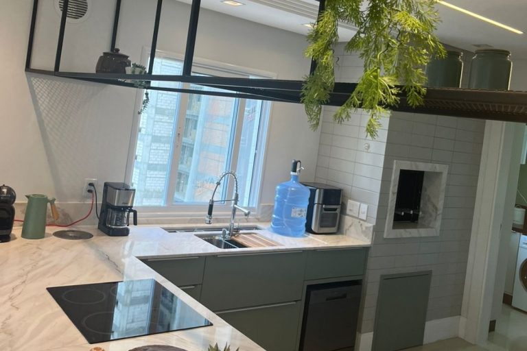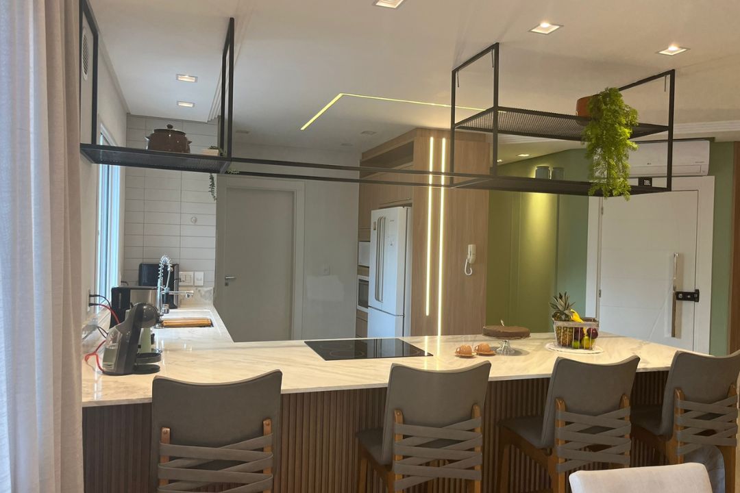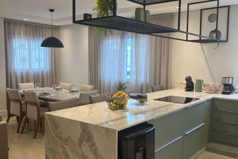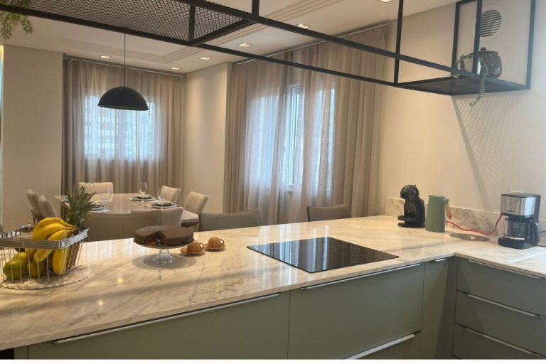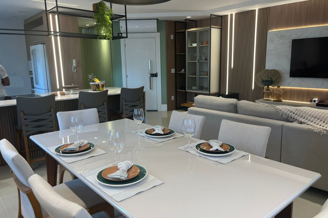 Apartamento com 03 suítes, living integrado com sala de estar, sala de jantar e cozinha com churrasqueira a carvão, lavabo, área de serviço e 03 vagas de garagem.