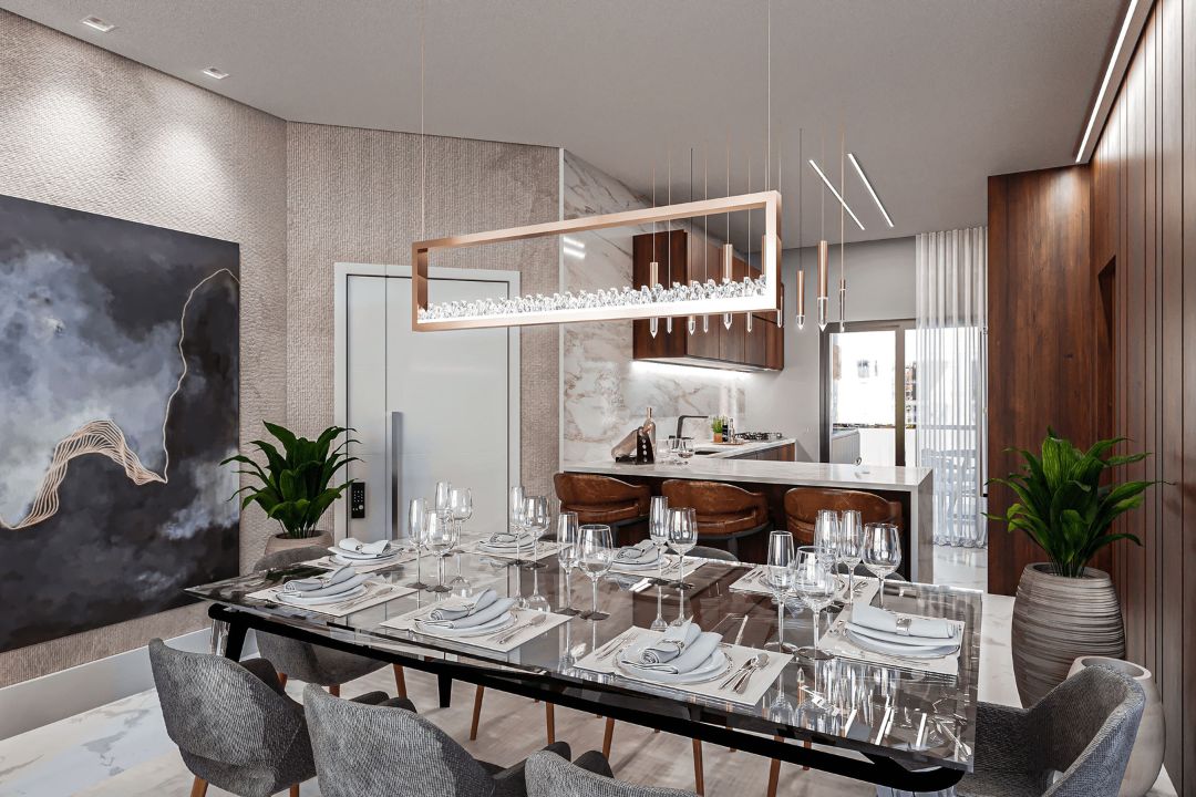 Apartamento com 146m² de área privativa, 04 suítes, sala de estar e jantar, lavabo, cozinha e 03 vagas de garagem.