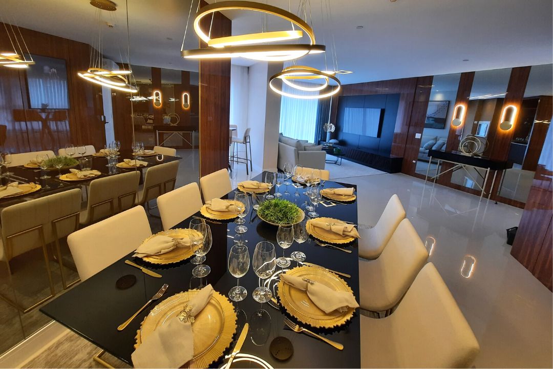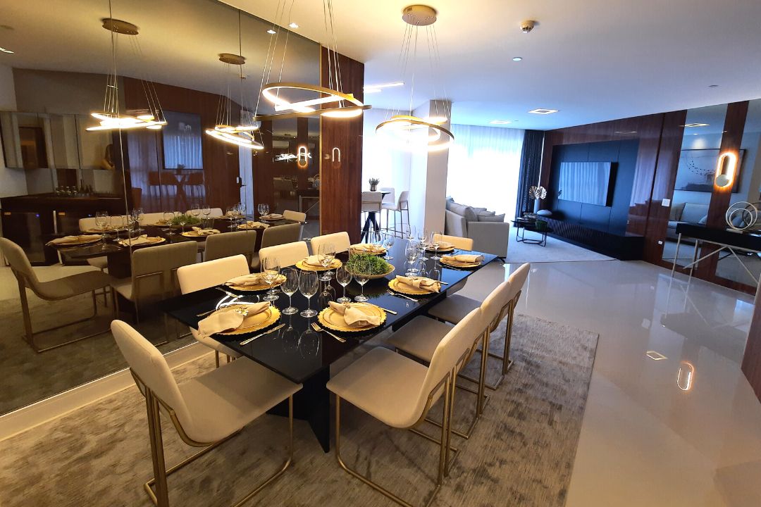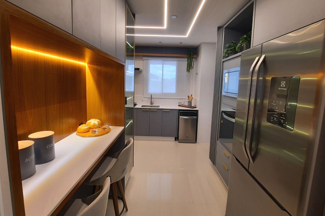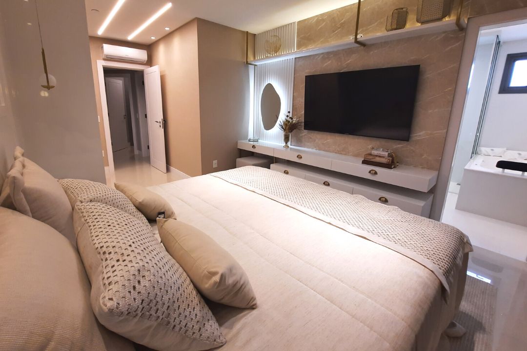 São 182m² com 4 suítes, sendo 1 máster com hidro, sacada integrada com churrasqueira a carvão, amplo living, lavabo, cozinha, área de serviço.