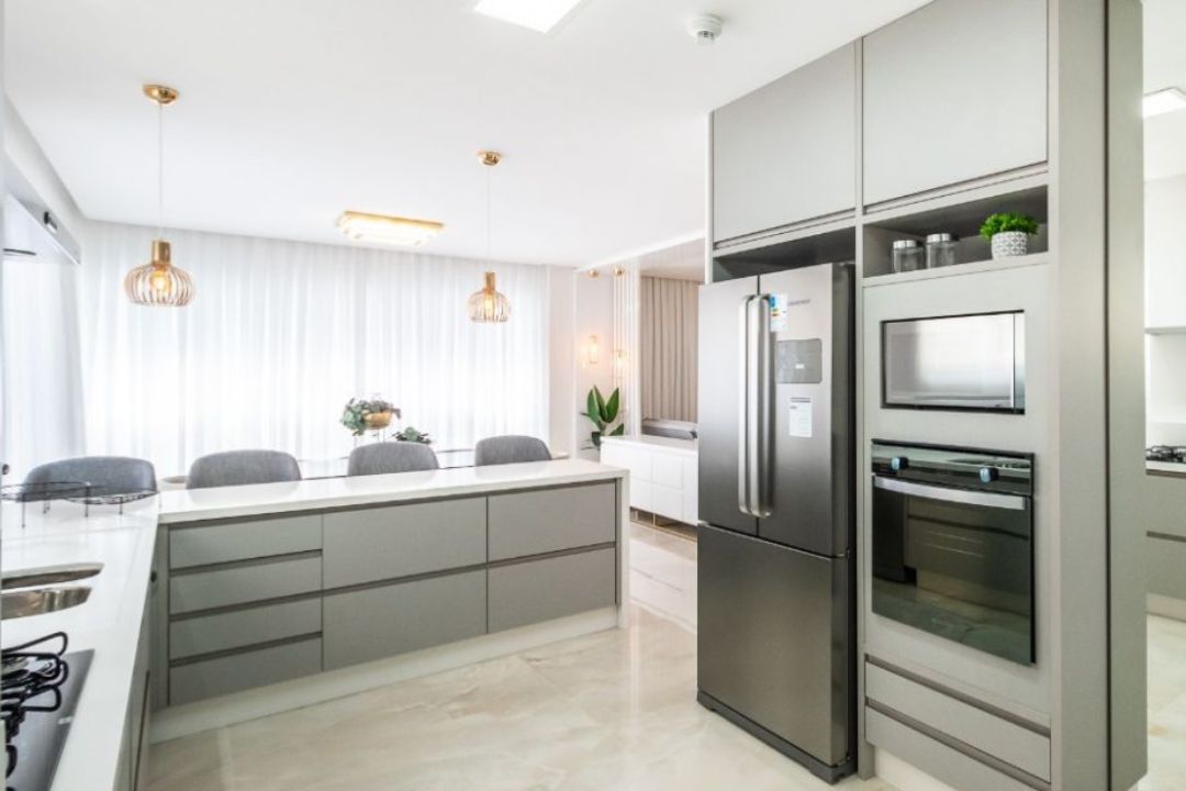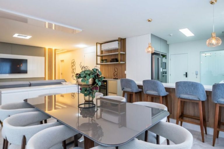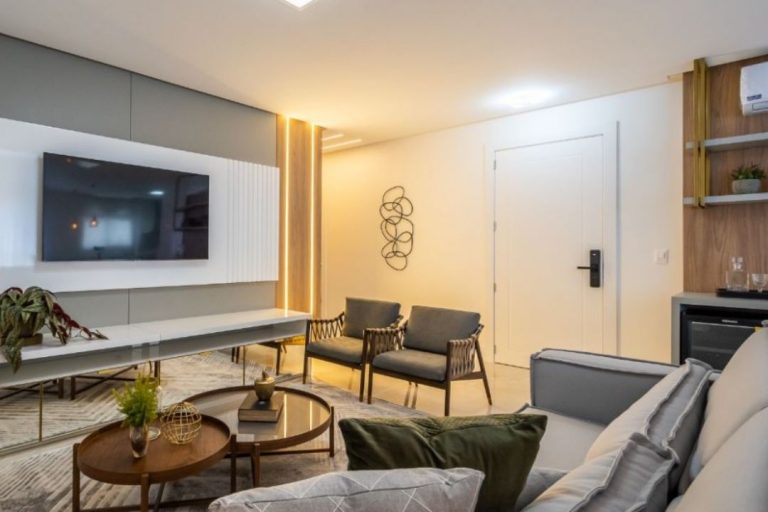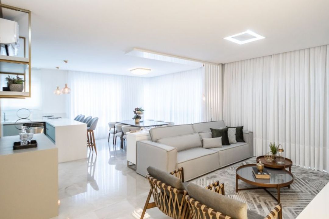 Conta com apartamento de 170 m² de área privativa, tem sua planta distribuída em quatro suítes, living integrado com sacada com churrasqueira à carvão, cozinha, área de serviços e lavabo e 03 vagas de garagem privativa.